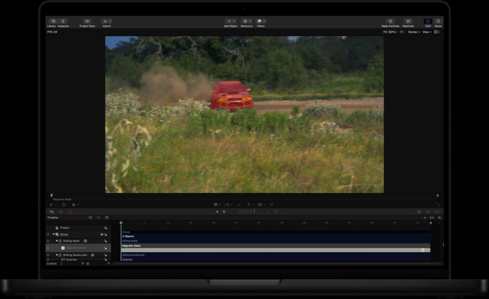 MacBook Pro 16, screen showing Motion workspace with green car driving through a field, red mask overlay