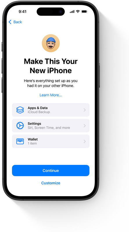 Restaurez votre appareil ou configurez-en un nouveau à partir de votre sauvegarde iCloud pour importer sans difficulté l’intégralité de vos photos, fichiers, contacts, apps, réglages, et plus encore. Votre appareil ressemblera trait pour trait au précédent.