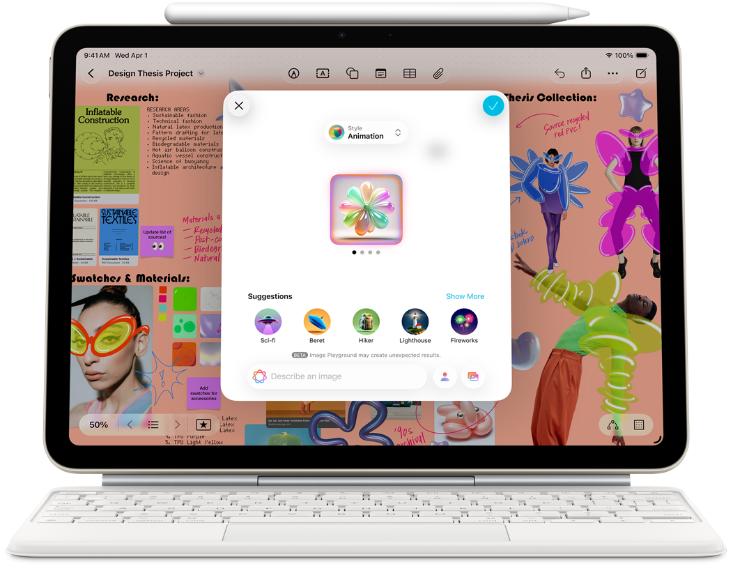 iPad Air en mode paysage présentant Apple Intelligence avec Image Playground, et Keynote, Apple Pencil Pro
