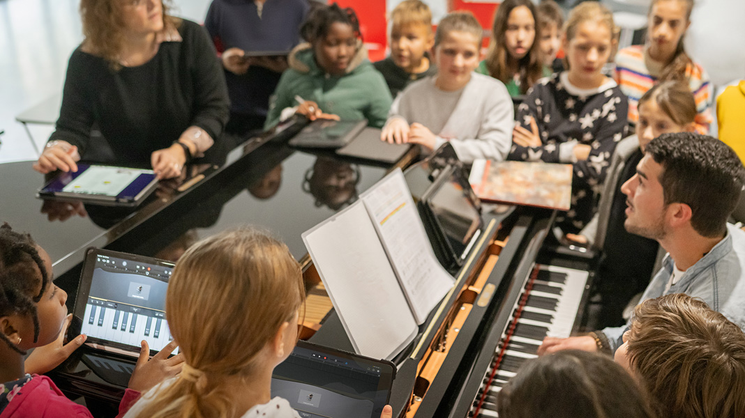 Que los profesores integren a sus clases estos nuevos métodos de aprendizaje tiene un impacto muy positivo para el progreso académico. En las clases de música, por ejemplo, los alumnos se sientan alrededor de un piano para tocar y hasta componen su propia música usando Pages y el Apple Pencil. Otros crean y graban en GarageBand sus propios sonidos en concierto junto con sus compañeros que tocan algún instrumento. En las clases de programación, usan CoSpaces Edu en el iPad para diseñar objetos en 3D y Swift Playground para hacer animaciones en entornos de realidad aumentada y realidad virtual.