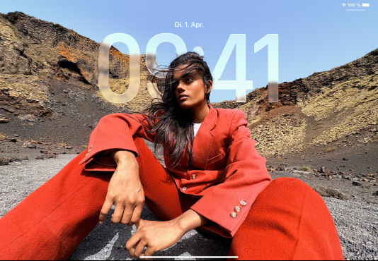 iPad entdecken Ein iPad und ein iPad Air nebeneinander, das iPad Air ist vorne und im Hochformat und überlagert das iPad, der Sperrbildschirm zeigt die Zeit  in transluzentem Liquid Glass Effekt
