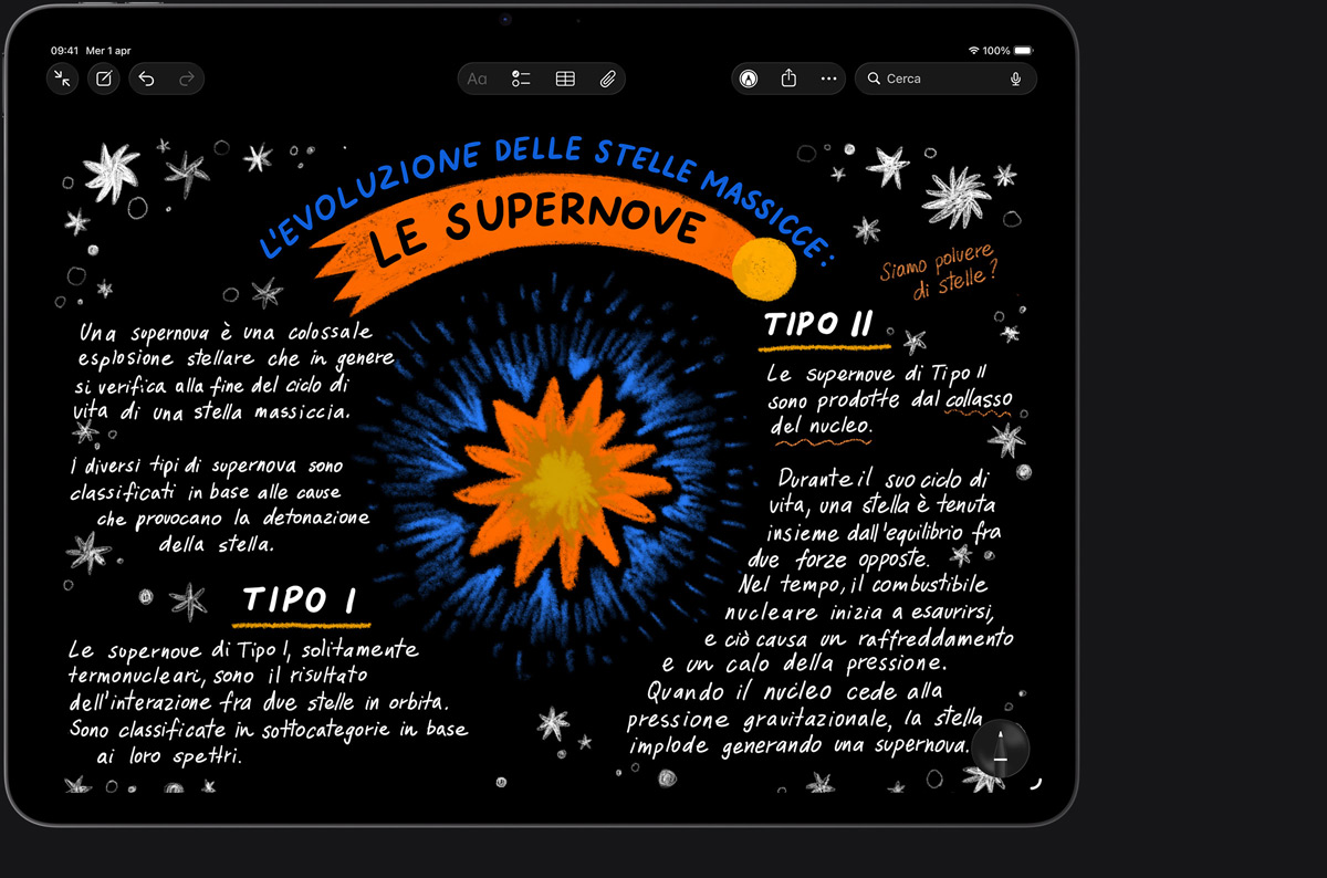 Disegna, dipingi, prendi appunti: Apple Pencil rende tutto più facile e intuitivo, come per magia. È precisa al pixel, ha una bassa latenza, cambia il tratto in base all’inclinazione. Mentre la usi puoi appoggiare la mano sullo schermo, proprio come faresti su un foglio. E Apple Pencil Pro ha una serie di funzioni ancora più evolute per aiutarti a dare vita alle tue idee.2