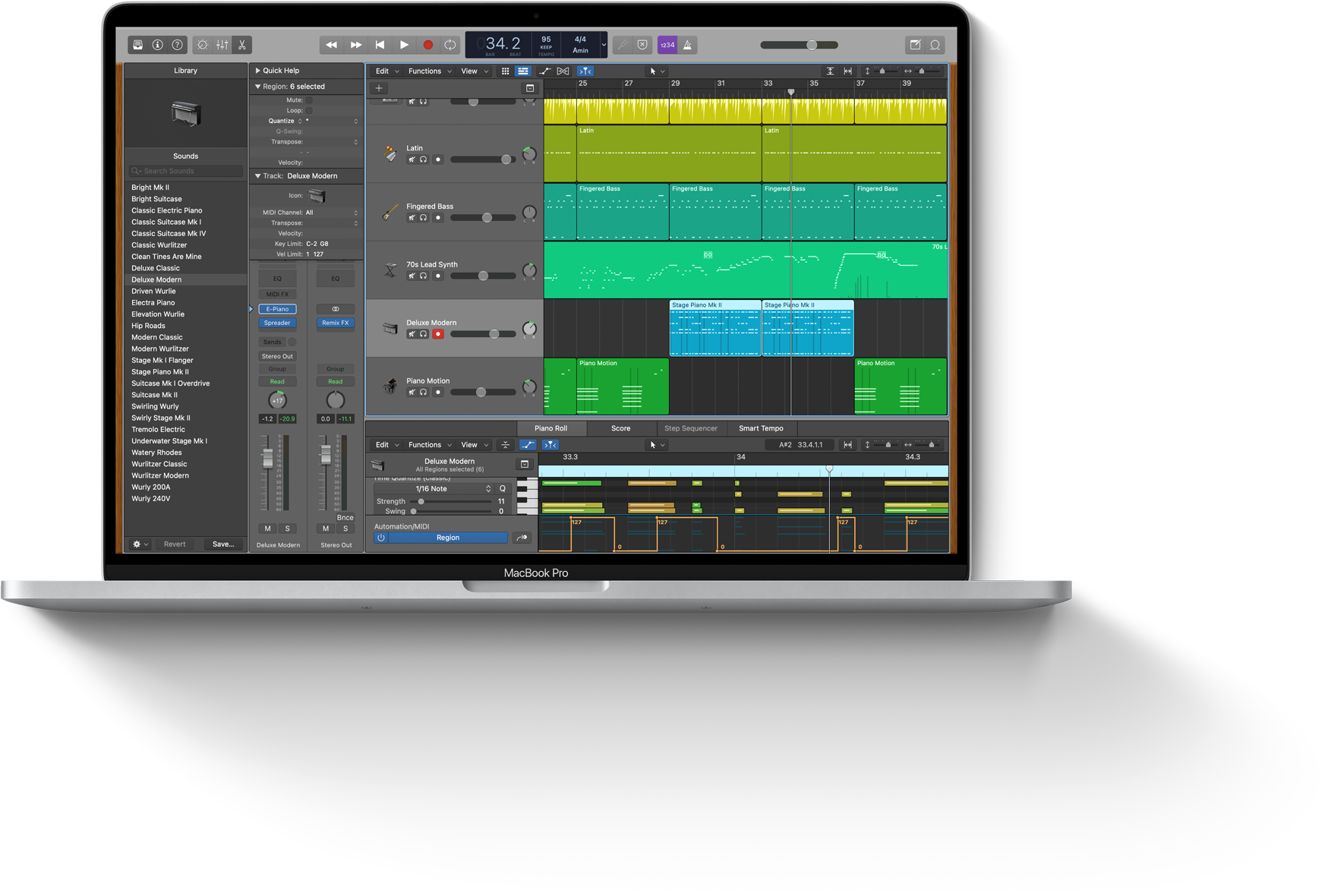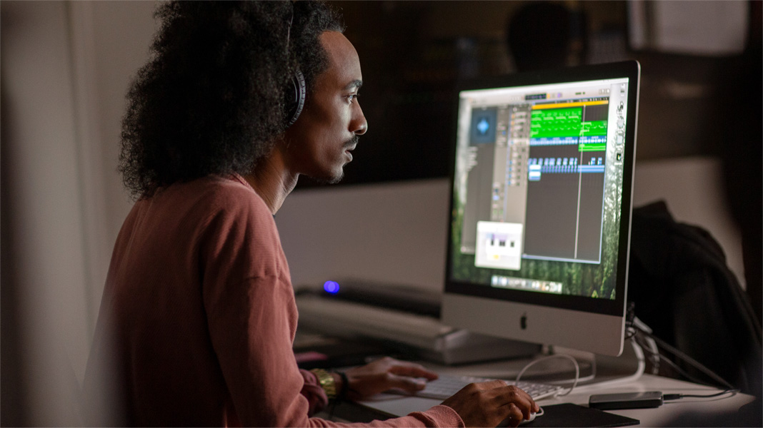 MacBook Pro。Hughes氏が、クリエイターやプロデューサーとして成功を収めるための準備を安心して任せているのが、オールインワンのこのプロフェッショナルツールです。MacのLogic Proは、音楽とサウンドデザインを教えるHughes氏のカリキュラム全体を支えています。学生たちは、プロレベルの音源集を使ってあらゆるジャンルの音楽を録音、編集、ミキシングする方法を学び、プロクオリティの作品集を制作して音楽業界での成功を目指します。