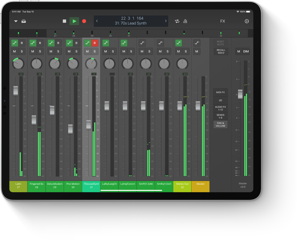iPad Pro。新曲のアイデアが頭に浮かぶと、Hughes氏はiPadのLogic Remoteアプリを使って演奏し、録音し、Multi-Touchジェスチャーでトラックをミックスします。そのすべてを、部屋のどこからでも行えます。