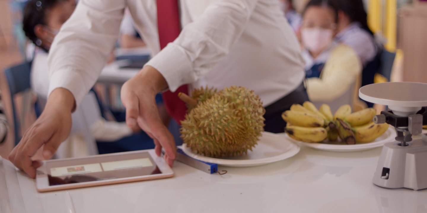小学校の 理科の 授業では、 iPadを 活用 しながら 様々な 果物の 重さに ついて 探究します。 -