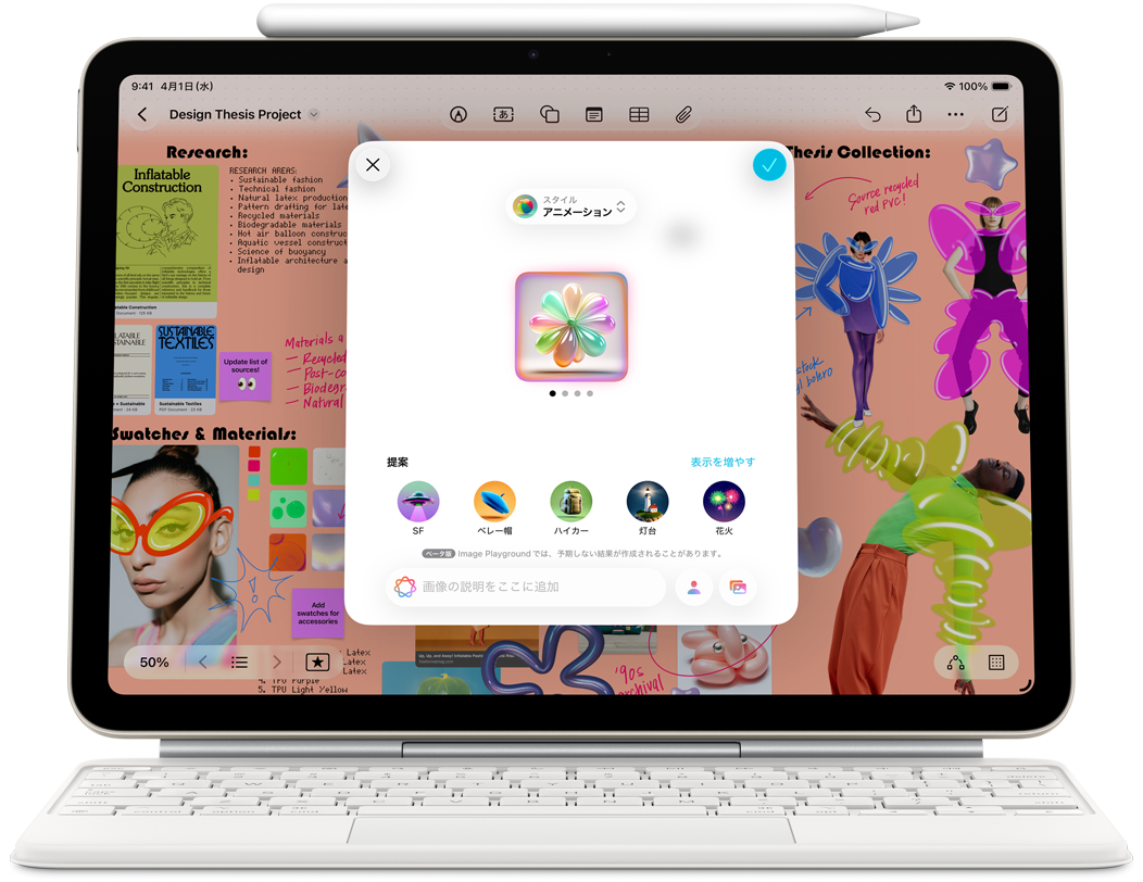 ワクワクする方法で自分らしいビジュアル表現を楽しむのも、Apple Intelligenceなら簡単。画像マジックワンドを使ってラフスケッチを関連性の高い画像に変換する。Image Playgroundで、説明や提案されるコンセプト、さらに写真ライブラリ内の人物をもとに新しい画像を生成することもできます。