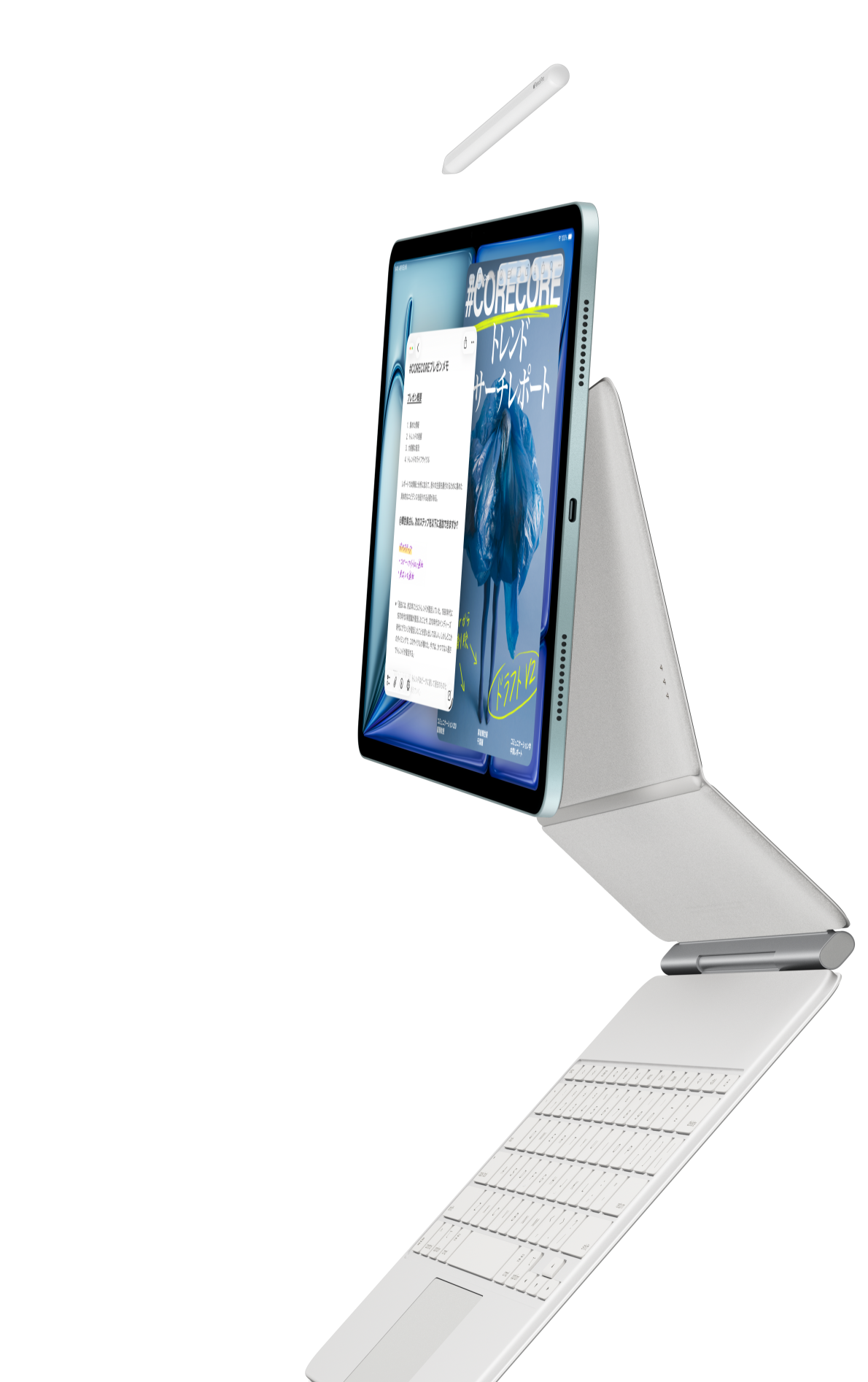 Magic Keyboardは、iPad Airの完璧なパートナー。ブラックとホワイトから選べます。薄くてポータブルなデザインに、驚くほど快適なキーボードトラックパッドを搭載しているので、高い精度が求められるタスクに理想的です。キーボードに追加された14のファンクションキー列。パススルー充電に対応したUSB-Cコネクタ。前面と背面をしっかり守るカバー。画面を様々な角度にスムーズに調整できるフローティングカンチレバーと、iPadOSでの作業方法を広げる大きなガラス製トラックパッドも魅力です2