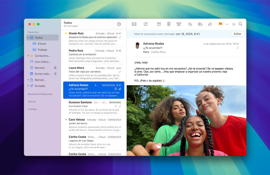 Mail en iCloud se integra a la perfección con la app Mail en tu iPhone, iPad o Mac. Y con iCloud.com puedes enviar y recibir correos desde cualquier lugar. Las funcionalidades de seguridad, como la protección contra correos no deseados y las opciones para prevenir el phishing, están diseñadas para impedir que tu bandeja de entrada se llene de correo basura. Además, configurar tu propia dirección de @icloud.com es facilísimo, y al suscribirte a iCloud+, podrás personalizarla con el dominio que quieras.