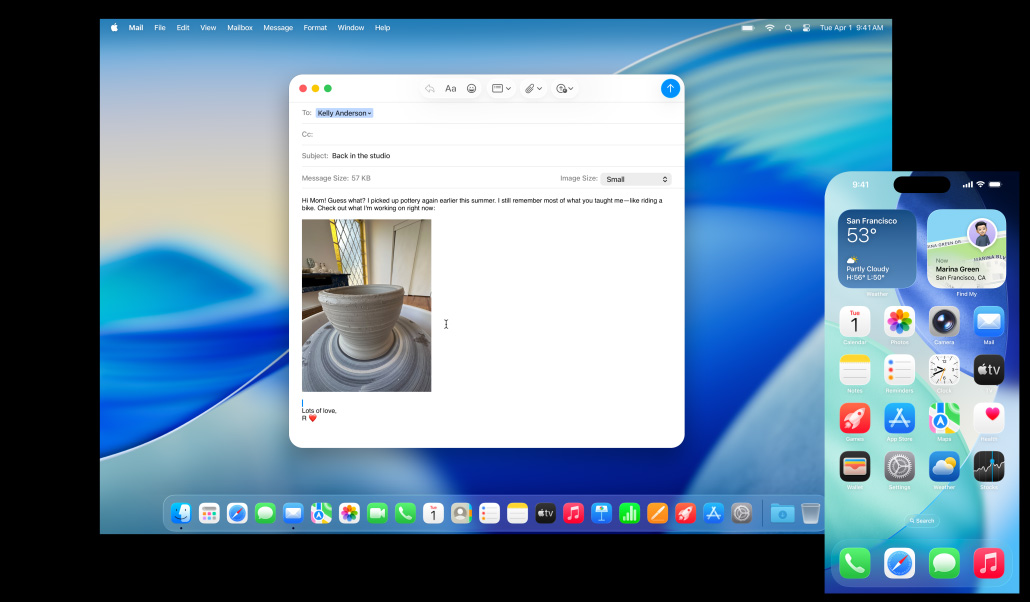 iPhone Mirroring lets you see and use your iPhone right from your Mac.5 So even if your phone is getting charged across the room, you can still access all your favorite iPhone apps. Live Activities from your iPhone also appear on your Mac. So when timely events occur — like when your Uber arrives — you don’t have to reach for your phone to stay in the know. You can even drag and drop a video from your Mac to your iPhone, so you can continue editing on the go.