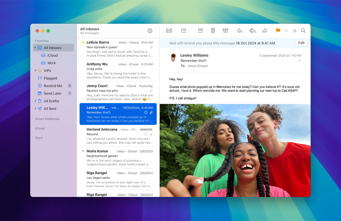 iCloud 郵件與你的 iPhone、iPad 或 Mac 上的郵件 app 全面整合,而透過 iCloud.com,你更可在任何地方輕鬆收發電郵。內置垃圾內容保護及防網絡釣魚等保安功能,幫你偵測並阻擋垃圾郵件傳送至你的收件箱。要設定你的 @icloud.com 電郵地址非常簡單,在訂購 iCloud+ 時,你可使用自訂網域來建立你的專屬電郵。
