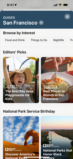 Guides help you find amazing things to see and do in cities around the world.3 Just tap the Explore Guides button to access nearly 1,000 expertly curated Guides, and find and save the ones that catch your eye. Curated Guides automatically update when new places are added, so you always have the latest recommendations at your fingertips. You can also create your own Guides and share them with friends and family.