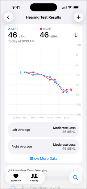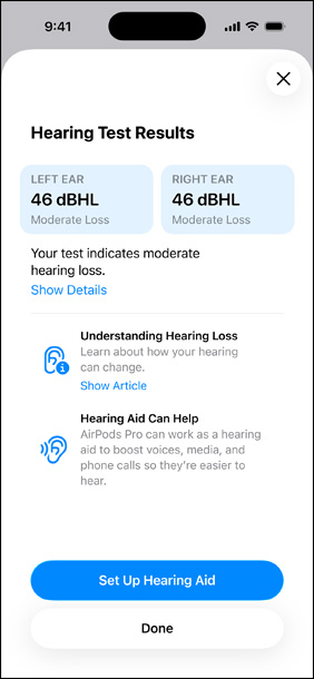 Øyeblikkelige resultater. Øyeblikkelig assistanse. Når du fullfører testen, får du en personlig profil med lettfattelige resultater og nyttig informasjon om hørselen din. Hvis testen viser at du har lite til ikke noe hørselstap, men fremdeles kan ha nytte av å høre bestemte frekvenser tydeligere, kan du justere Mediehjelp-innstillingene og forbedre lyden for anrop og medier. Hvis du har mildt til moderat hørselstap, blir du bedt om å konfigurere Høreapparat-funksjonen.