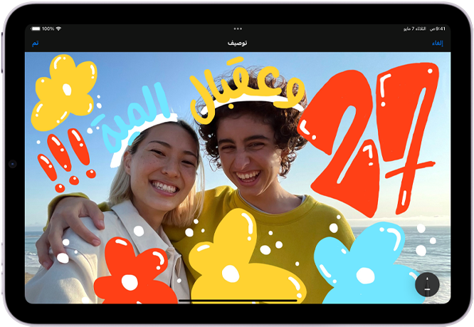 على الجهة اليسرى، iPad الجيل العاشر، في الوضع الأفقي، يعرض رسماً غرافيكياً مع ملاحظات ورسومات وقلم Apple‏ USB-C مُثبت أعلى الجهاز. على الجهة اليمنى، iPad mini، في الوضع الأفقي يعرض رسماً توضيحياً بألوان زاهية تم إنجازة باستخدام ProCreate.